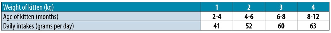 המזון מתאים במיוחד לגורי חתולים הנמצאים בשלב גדילה מהיר, וכן לנקבות הרות או מניקות – ניתן להגיש להן את המזון באופן חופשי (“ad libitum”) בהתאם לצרכים התזונתיים.